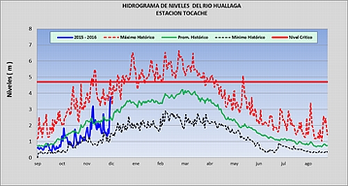 El SENAMHI, organismo adscrito al Ministerio del Ambiente, informa que debido a las persistentes lluvias que se vienen presentando en la selva central, continua el incremento del nivel de agua de los principales ríos de la región hidrográfica del Amazonas. El río Huallaga en la estación hidrométrica de Tocache, registro al momento un nivel de 3.82 m, encontrándose con tendencia ascendente y con un promedio de 1.24 m por encima de su promedio histórico, y a 1 m por debajo del nivel crítico .En la estación hidrométrica Chazuta registra al momento un nivel de 14.82 m encontrándose con tendencia ascendente y con un promedio de 1.22 m por encima de su promedio histórico, y a 2.61 m por debajo del nivel crítico. En la estación hidrométrica Picota (San Martín), continúa con tendencia ascendente y reporta un nivel de agua de 19.60 m encontrándose con 2.76 m por encima de su promedio histórico, se prevé el incremento del nivel de agua de este río, y podría seguir afectando nuevas áreas en las localidades de Picota, San Hilarión, San Cristóbal de Puerto Rico, principalmente. Por otro lado en el río Huayabamba, tributario del rio Huallaga en la estación hidrométrica Huayabamba, continua con tendencia ascendente y reporta un nivel de agua de 12.16 m encontrándose con 2.54m por encima de su promedio histórico. Ante esta situación informamos a las autoridades tomar las previsiones del caso ya que se podrán ir afectando nuevas áreas ribereñas de estos cursos de agua, eventualmente centros poblados y zonas agrícolas. El SENAMHI continuara informando oportunamente sobre la evolución de las condiciones hídricas y otros fenómenos de origen hidrometeorológico, a fin de que se desarrollen acciones de prevención.