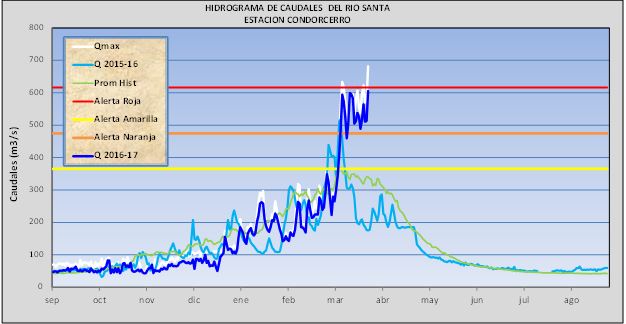 El SENAMHI, organismo adscrito al Ministerio del Ambiente, informa que, dado que nos encontramos en el periodo más húmedo de la temporada y en base al aviso meteorológico N°041 lluvias en la Sierra, en las últimas horas se han registrado lluvias en zonas altas de Ancash, ocasionando incremento en los niveles del río Santa. A las 15: 00 hrs de hoy 27 de marzo, en la estación Condorcerro se registró un valor promedio de 605 m3/s ubicándose en 2 % por debajo de su valor crítico de desborde.