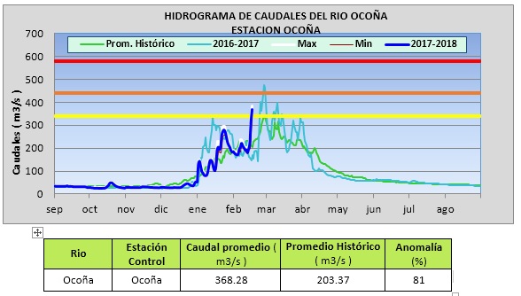 El SENAMHI, organismo adscrito al Ministerio del Ambiente, informa que, a consecuencia de la intensificación de precipitaciones en los últimos días en la sierra sur, se registran incrementos en los niveles de agua y caudal del río Ocoña. A la emisión del presente aviso, en el punto de control hidrológico Ocoña, registra un valor de nivel de agua de 2.63 m., que representa un caudal de 203.37 m3/s, superior a su promedio histórico en 81% y un caudal máximo instantáneo de 383.87 m3/s (09:00 horas); lo cual representa un valor superior a sus promedio histórico en 89%. De esta manera, se encuentra en un nivel de ¿Alerta Hidrológica Amarilla¿, con tendencia a seguir incrementándose en los siguientes días.
