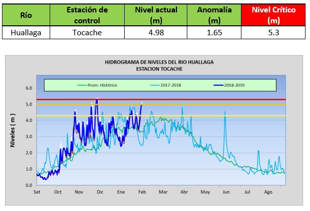 El SENAMHI, organismo adscrito al Ministerio del Ambiente, informa que el río Huallaga registra un incremento en el nivel de agua y caudal debido a las lluvias en la selva central del país. Según la estación hidrológica Tocache (San Martín), hasta la emisión del presente aviso (18:00 p.m.), registró un nivel de agua máximo de 4.98 m, valor superior en 1.65 m a su nivel promedio e inferior en 0.32 m. a su valor crítico de desborde.