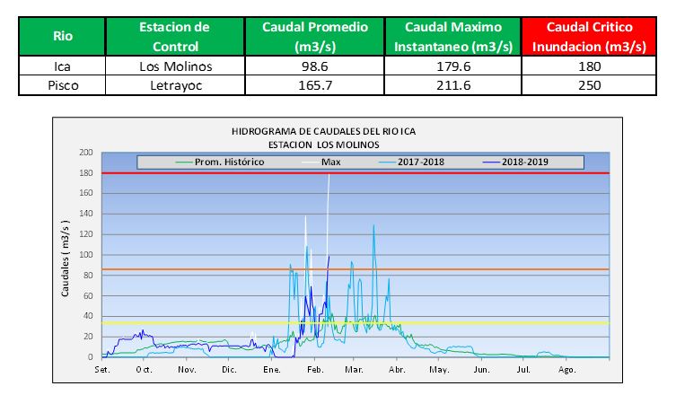 El SENAMHI, organismo adscrito al Ministerio del Ambiente, informa que los ríos Ica y Pisco registran incrementos significativos en sus caudales en las últimas horas debido a las intensas lluvias que se presentan principalmente en las partes altas de las cuencas mencionadas. Los valores máximos registrados hasta las 18:00 horas del día de hoy, son detallados en la Tabla adjunta. Esta descarga podría incrementarse en las próximas horas, al momento se mantiene en el umbral hidrológico naranja.