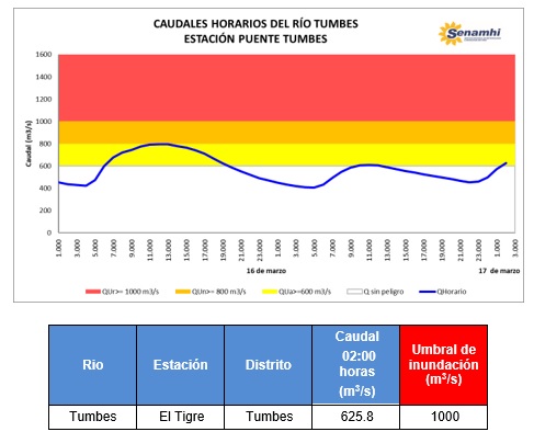 El SENAMHI, organismo adscrito al Ministerio del Ambiente, Informa que el viernes 16 de marzo desde la 07:00 pm se presentó lluvia de moderada a fuerte intensidad acompañada de descargas eléctricas en la cuenca media del río Tumbes, esta lluvia se desplazó ligeramente hacia el suroeste registrando sus máximos valores en el periodo de 07:00 a 09:00 pm, para luego presentarse de ligera intensidad. Esta condición meteorológica favoreció para un incremento importante de los caudales en el río Tumbes. A las 02:00 horas del día de hoy, el río Tumbes en la estación Puente Tumbes ha registrado un caudal estimado de 625.8 m3/s (umbral hidrológico amarillo). Por lo que se descarta algún potencial de desborde, y se recomienda a la población precaución al realizar actividades cerca del río.