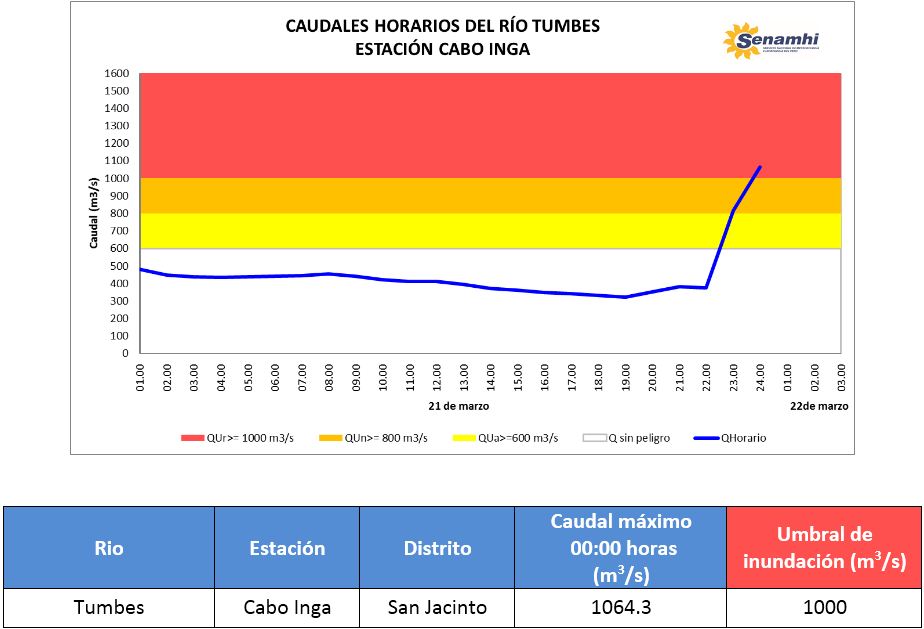 El SENAMHI, organismo adscrito al Ministerio del Ambiente, Informa que el jueves 21 de marzo desde la 04:00 pm se presentó lluvia de moderada a fuerte intensidad acompañada de descargas eléctricas en la zona de Puyango (Ecuador), esta lluvia se mantuvo hasta las 08:00 pm, para luego presentarse de ligera intensidad. Esta condición meteorológica viene generando el incremento del caudal del río Tumbes. A las 00:00 horas de hoy 24 de marzo, en la estación hidrológica Cabo Inga se registró un caudal máximo de 1064.4 m3/s (umbral hidrológico rojo). Se estima que esta crecida estaría arribando a la ciudad de Tumbes aproximadamente antes del mediodía; lo que podría afectar las áreas agrícolas de la zona baja de San Jacinto, Pampas de Hospital, Corrales, San Juan de la Virgen y Tumbes.