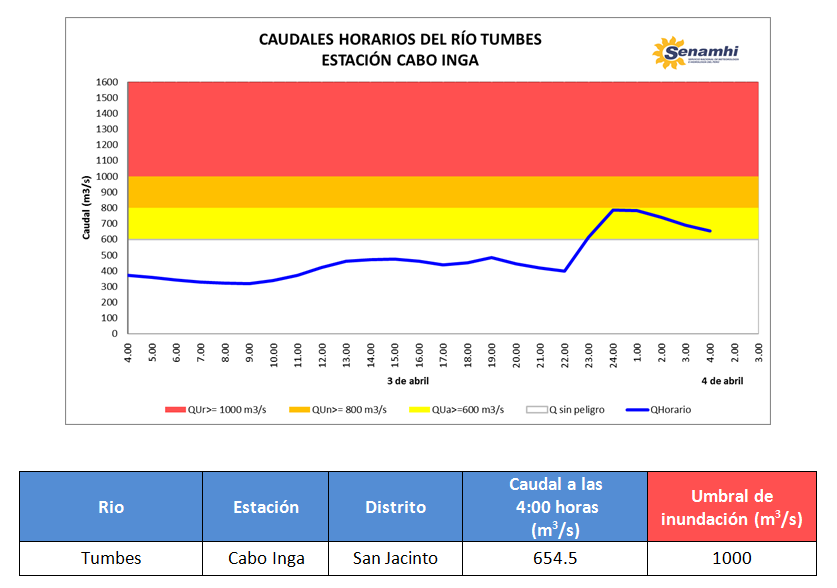 El SENAMHI, organismo adscrito al Ministerio del Ambiente, Informa que el miércoles 03 de abril desde la 19:00 pm se presentó lluvia de moderada a fuerte intensidad acompañada de descargas eléctricas en la zona de Puyango (Ecuador), esta lluvia se mantuvo hasta las 22:00 pm, para luego presentarse de ligera intensidad. Esta condición meteorológica favoreció el incremento del caudal del río Tumbes. A las 01:00 horas de hoy 04 de abril, en la estación hidrológica Cabo Inga se registró un caudal máximo de 786.9 m3/s (umbral hidrológico amarillo). Se recomienda a la población tomar precaución al realizar actividades cerca del río.