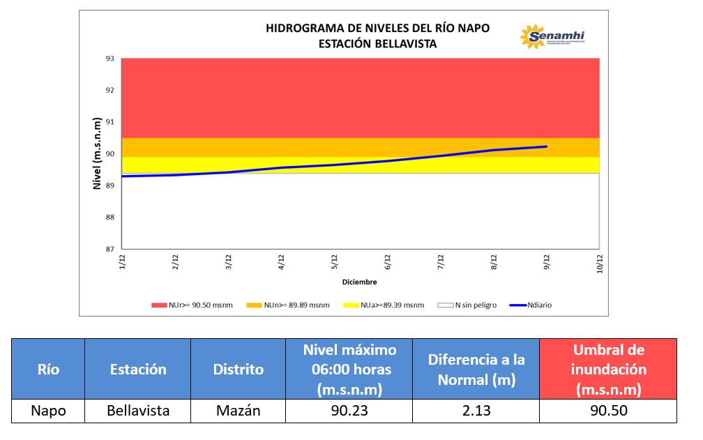 El SENAMHI, organismo adscrito al Ministerio del Ambiente, informa que se registra el incremento del nivel del río Napo en el departamento de Loreto, como resultado de la intensificación de las precipitaciones sobre la cuenca. La estación de hidrológica Bellavista presentó hoy lunes 09 de diciembre a las 06:00 h, un nivel de 90.23 m.s.n.m.; lo que representa 2.13 m por encima de su nivel normal, con lo que se ubica en Umbral Hidrológico Naranja. Por el momento, se descarta algún potencial de desborde. Se recomienda a la población tomar las precauciones correspondientes y evitar realizar actividades cercanas al río.