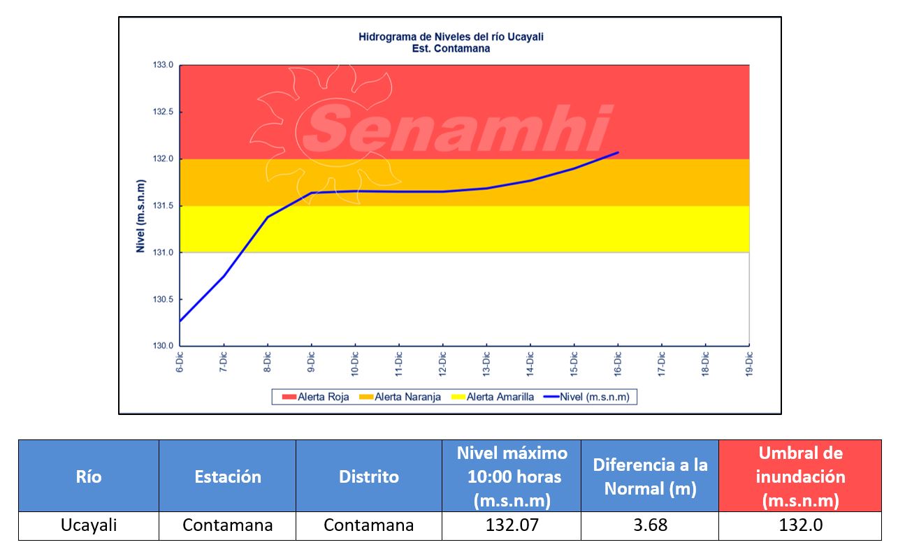El SENAMHI, organismo adscrito al Ministerio del Ambiente, informa que se viene registrando el incremento del nivel del río Ucayali en el Departamento de Loreto, como resultado de las precipitaciones de moderada a muy fuerte intensidad sobre la cuenca, conforme al aviso meteorológico N°180. La estación hidrológica de Contamana, registró hoy lunes 16 de diciembre a las 10:00 h, un nivel de 132.07 m.s.n.m.; lo que representa 0.07 m por encima de su nivel crítico, ubicándose en el Umbral Hidrológico Rojo. Este incremento podría ocasionar posibles desbordes. Se recomienda a la población tomar precauciones correspondientes y evitar realizar actividades cercanas al río.