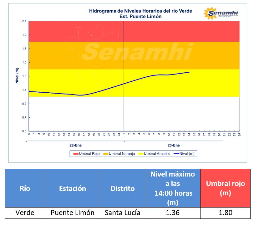 El SENAMHI, organismo adscrito al Ministerio del Ambiente, informa que el río Verde en la región Puno viene incrementando su nivel de agua, como resultado de la intensificación de la precipitación de moderada a fuerte intensidad ocurrida en la cuenca en las últimas horas, conforme al aviso meteorológico N°18. Hoy miércoles 23 de enero a las 14:00 h, la estación hidrológica Puente Limón registró un nivel máximo de 1.36 m. Se espera que continúe esta tendencia ascendente y alcance el Umbral Hidrológico Naranja. Las áreas posibles de afectación serían zonas medias y bajas de la cuenca, y zonas agrícolas en el distrito de Santa Lucía en la provincia de Lampa. Se recomienda tomar las precauciones correspondientes y evitar realizar actividades cercanas al río.