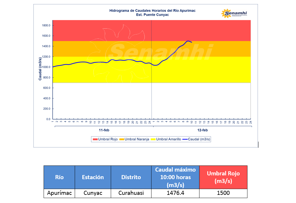 El SENAMHI, organismo adscrito al Ministerio del Ambiente, informa que el río Apurímac en la región Apurímac, ha presentado incrementos en su nivel de agua como resultado de la precipitación ocurrida en la cuenca. Hoy miércoles 12 de febrero a las 10:00 h, la estación hidrológica Puente Cunyac alcanzó un caudal instantáneo de 1476.4 m3/s y se ubica en Umbral Hidrológico Naranja. La zona posible de afectación sería el distrito de Curahuasi, provincia de Abancay, región Apurímac. Se recomienda a la población tomar las precauciones correspondientes y evitar realizar actividades cercanas al río.
