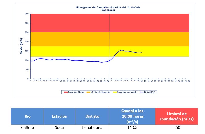 El SENAMHI, organismo adscrito al Ministerio del Ambiente, informa el incremento del nivel del río Cañete, en el departamento de Lima, como resultado de las contínuas precipitaciones de moderada a fuerte intensidad sobre la cuenca, conforme al aviso meteorológico N°081. La estación hidrológica Socsi registró hoy lunes 06 de abril a las 10:00 hrs un caudal de 140.5 m3/s, encontrándose en un umbral hidrológico amarillo. Se recomienda a la población tomar las precauciones correspondientes y evitar realizar cualquier actividad cercana al río.