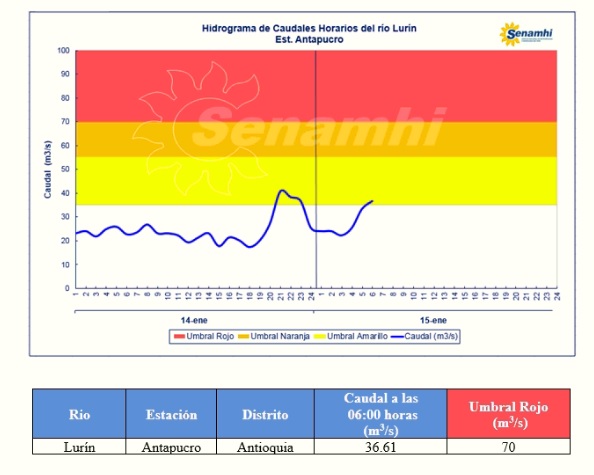 El SENAMHI, organismo adscrito al Ministerio del Ambiente, informa que el río Lurín, en la región Lima, en las últimas horas mantiene un comportamiento ascendente. El día viernes 15 de enero a las 06:00 hrs, la estación hidrológica Antapucro, registró un caudal de 36.6 m3/s, ubicándose en el Umbral Hidrológico. Las potenciales áreas de afectación serían Puente Guayabo, Manchay Bajo, Puente Cieneguilla, Antapucro y Tomina. Se recomienda a la población tomar las precauciones correspondientes y evitar realizar cualquier actividad cercana al río.