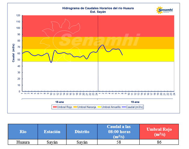 El SENAMHI, organismo adscrito al Ministerio del Ambiente, informa un incremento del caudal del río Huaura, en el departamento de Lima, como resultado de las continuas precipitaciones sobre la cuenca. La estación hidrológica Sayán registró hoy martes 19 de enero a las 08:00 h un caudal de 58 m3/s, encontrándose en un umbral Hidrológico Amarillo. Se prevé para las próximas horas mantenga un comportamiento estable a leve ascenso. La posible zona de afectación sería el distrito de Sayán en la provincia de Huaura. Se recomienda a la población tomar las precauciones correspondientes y evitar realizar cualquier actividad cercana al río.